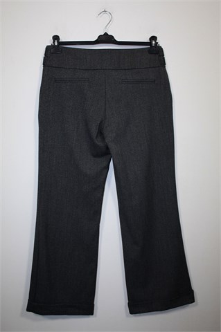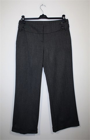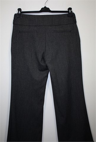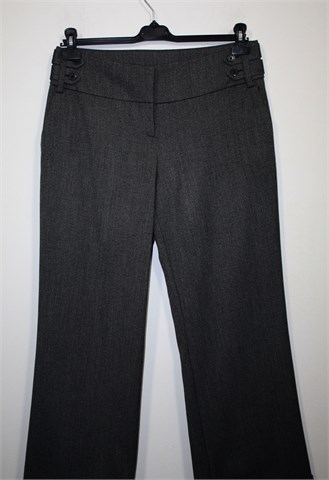 Yessica (C&A) hlače prošarano crno-bijele boje (djeluju sivo), od tanjeg i mekanog štofastog materijala. Klasični kroj - prednji cif i kopčanje, bočne ušice za remen i ukrasne kopčice sa remenčićima (po dva sa svake strane). Prednji bočni, stražnji lažni/ukrasni džepići. Šire nogavice, mandžete na dnu (mjestimično su se šavovi na mandžetama malo odpustili pa ih trebalo uhvatiti koncem). Blago rastezljive.