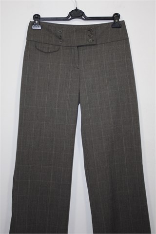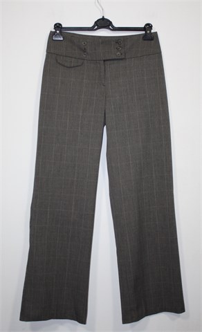 Yessica (C&A) hlače od tanjeg i mekanog štofa, sivo-smeđe boje sa uzorkom na materijalu. Prednji cif i kopčanje, ukrasni gumbići na pasici i mali ukrasni džepić sa prednje strane. Blago rastezljive.