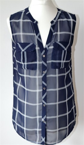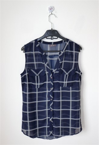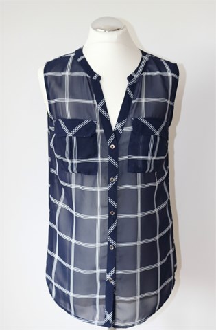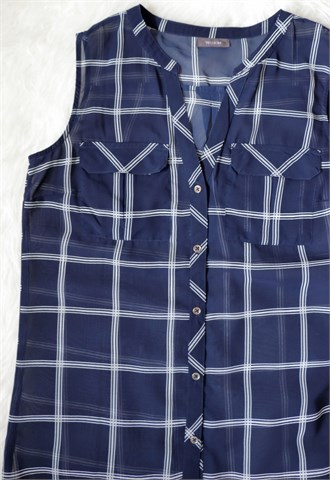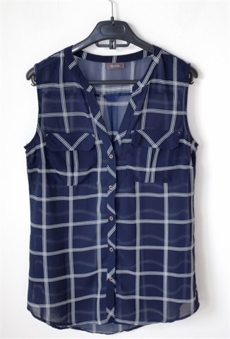 Yessica (C&A) košulja bez rukava, tamno plave boje sa bijelim prugastim uzorkom (vidjivo na slikama). Džepovi na prsima, prednje kopčanje. Providna, nešto duža sa stražnje strane (vidjeti mjere).