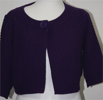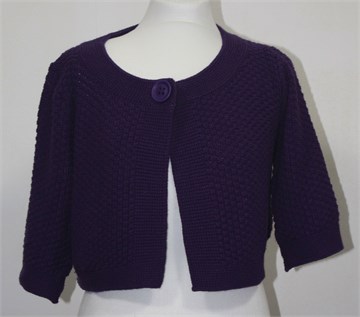 Yessica (C&A) kraća vesta/bolero ljubičaste boje, sa prednjim kopčanjem na jedan gumb. Deblje i rastezljivo končano pletivo. Poludugi rukavi.