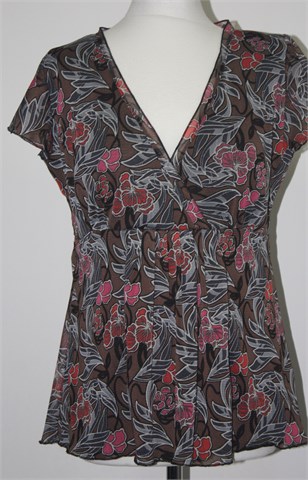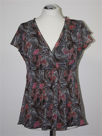 Yessica (C&A) majica sa kratkim rukavima, smeđe boje sa cvjetnim printom. Prednji fiksni preklop, gumica ispod prsiju pa je širina prilagodljiva. Lagan, tanji i vrlo rastezljiv materijal (mrežast). Podstavljena.