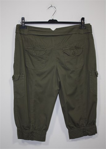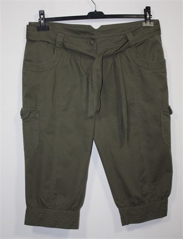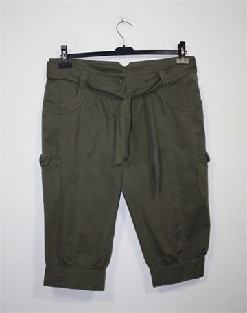 Yessica (C&A) poluduge hlače maslinasto zelene boje (blago ispranog izgleda). Prednji cif i kopčanje, pasica za remen. Prednji bočni, stražnji džepovi sa preklopom i gumbom. Pripadajući remen od istog materijala. Tanji i lagan pamuk.
