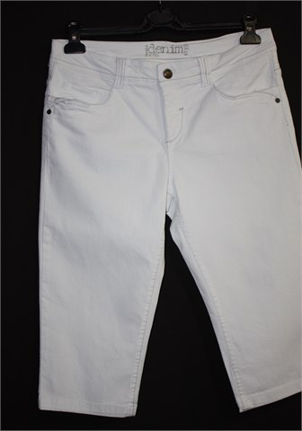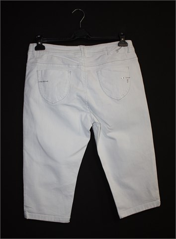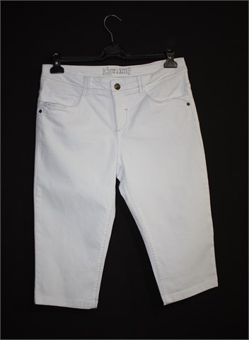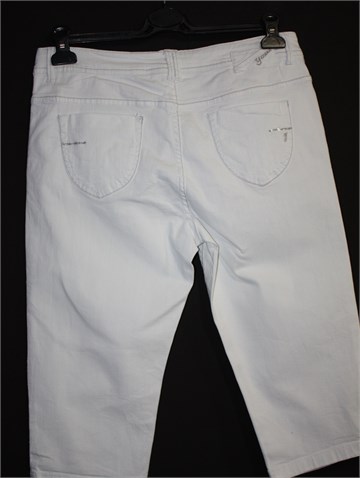 Yessica (C&A) poluduge traper hlače bijele boje. Prednji cif i kopčanje, pasica za remen. Prednji i stražnji džepovi, prošivene sivim i bijelim koncem (mjestimično našivene sive ukrasne šljokice). Rastezljive.
