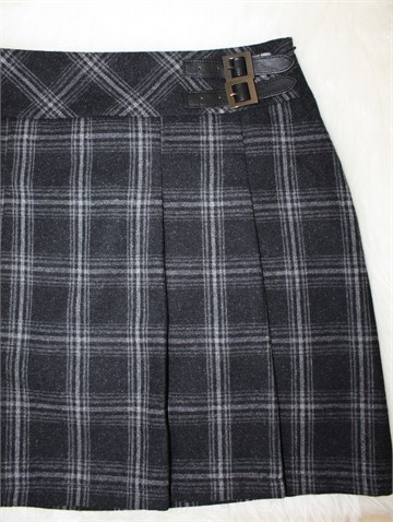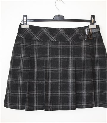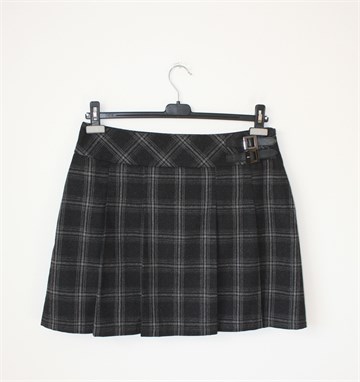 Yessica (C&A) suknja crne boje sa sivim uzorkom (vidljivo na slikama), falde sa prednje strane. Bočni cif, podstavljena. Na pasici sa prednje bočne strane dva ukrasna remenčića. Tanji vunasti štof.