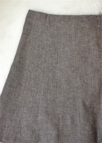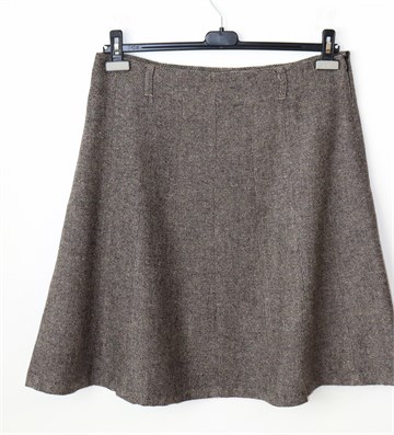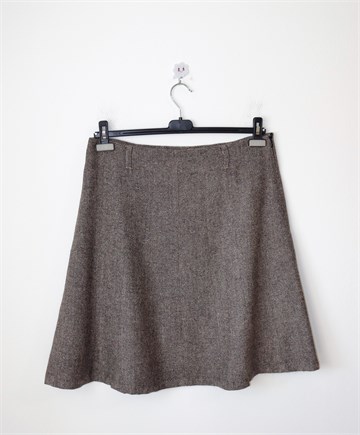 Yessica (C&A) suknja od štofastog materijala, prošarano smeđe boje (sitni uzorak riblje kosti i diskretni špricani detalji u boji - kao upletene niti u tkanju). Bočni cif, pasica za remen. Podstavljena.
