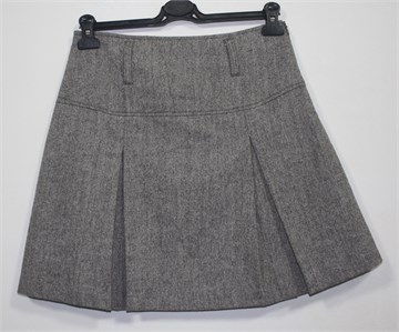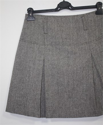 Yessica (C&A) zimska suknja od štofa/tvida, prošarano smeđe-bijele boje. Bočni cif, ušice za remen. Prednje i stražnje falde, podstavljena.