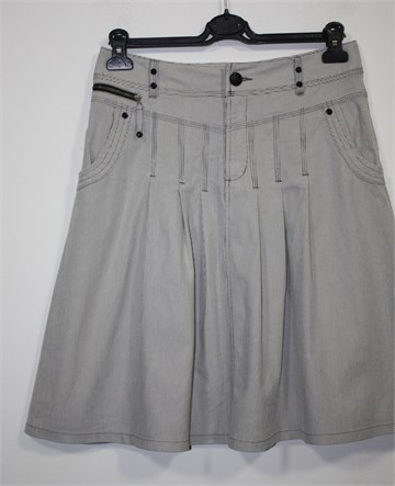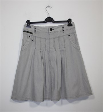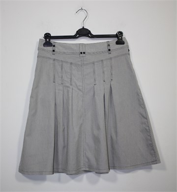 Yessica (C&A) suknja bijele boje sa plavo-sivim prugama. Prednji cif i kopčanje, pasica za remen. Prednji bočni džepovi, ukrasni ušitci i falde sa prednje i stražnje strane. Blago rastezljiva.