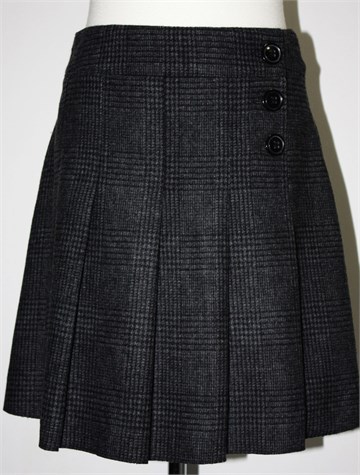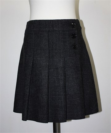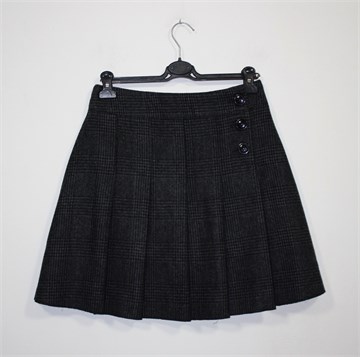 Yessica (C&A) zimska suknja, sive boje s uzorkom i faldama (s obje strane). Prednje kopčanje sa tri gumba i jednim unutarnjim (lažni preklop), podstavljena. Deblji i topli materijal.