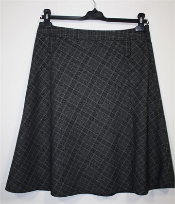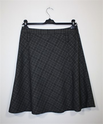 Yessica (C&A) suknja prošarano crno-sivo-bijele boje sa prugastim uzorkom (vidljivo na slikama). Bočni cif i gumbić, pasica za remen. Tanji i mekani štof, nije podstavljena. Blago rastezljiva.