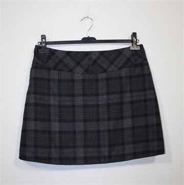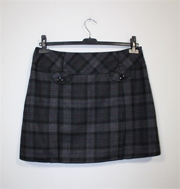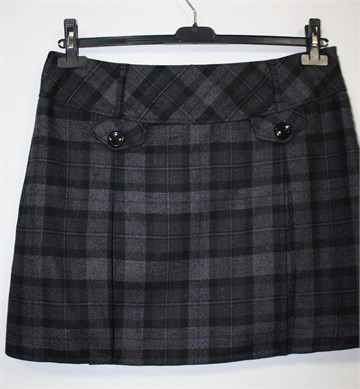 Yessica (C&A) suknja sivo-crne boje sa ljubičastim uzorkom (kao na slikama). Bočni cif, pasica za remen. Prednji ukrasni džepići (samo preklopi sa gumbom), dva prednja ušitka/falde (još uvijek zašivene). Deblji štofasti materijal, postavljena.