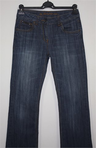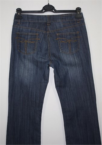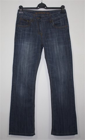 Yessica (C&A) traper hlače srednje plave boje, mjestimično ispranog izgleda (tvornički used look). Prednji cif i kopčanje, pasica za remen. Prednji i stražnji džepovi (stražnji sa ukrasnim prošivima od konca). Vrlo blago rastezljive. Skraćivane nogavice.