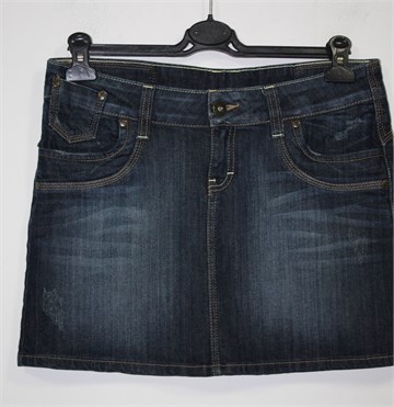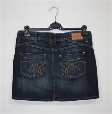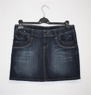Yessica (C&A) traper suknja, plave boje mjestimično ispranog i iscufanog izgleda (tvornički used look). Prednji cif i kopčanje, pasica za remen. Prednji i stražnji džepovi. Blago rastezljiva.