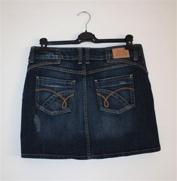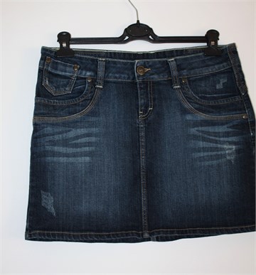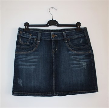 Yessica (C&A) traper suknja, tamnije plave boje mjestimično ispranog i ocufanog izgleda (tvornički used look). Prednji cif i kopčanje, pasica za remen. Prednji i stražnji džepovi. Blago rastezljiva.