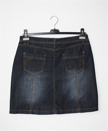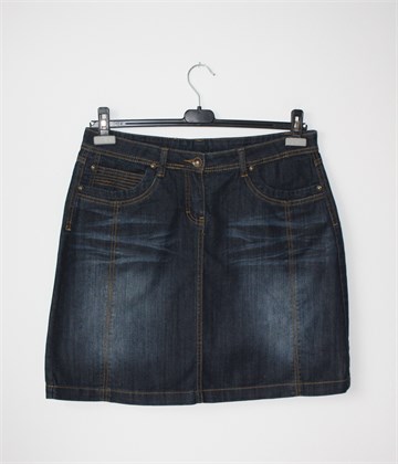 Yessica (C&A) traper suknja tamnije plave boje, mjestimično ispranog izgleda (tvornički used look). Prednji cif i kopčanje, pasica za remen. Prednji i stražnji džepovi, vrlo blago rastezljiva.