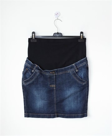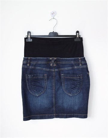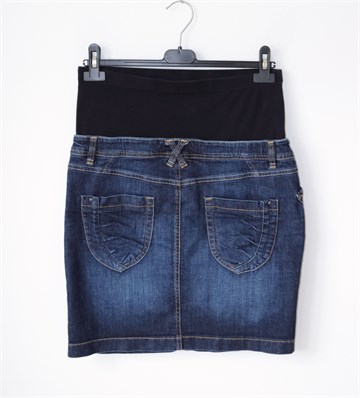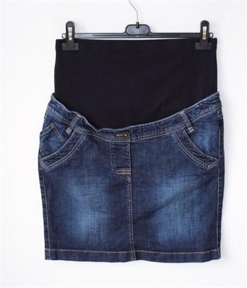Yessica (C&A) traper suknja za trudnice, plave boje. Mjestimično ispranog izgleda (tvornički used look). U gornjem dijelu materijal tamno plave boje, oba materijala rastezljiva. Regulacija širine struka unutar pasice (bočne gumice sa gumbićem).