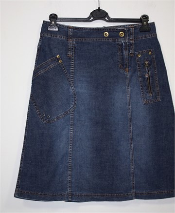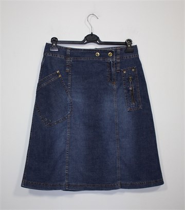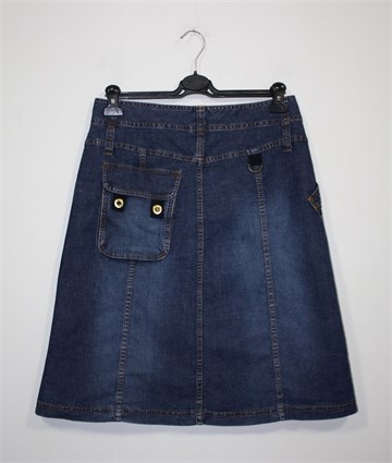 Yessica (C&A) traper suknja, srednje plave boje mjestimično ispranog izgleda. Prednji cif i kopčanje, dupla pasica za remen. Džepovi (različiti, sa obje strane). Blago rastezljiva.