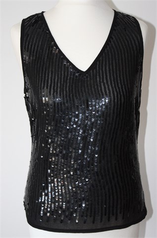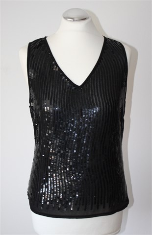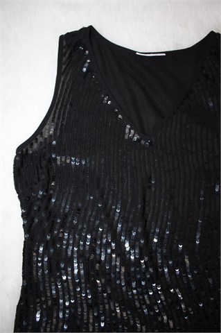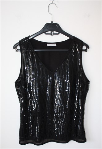 Yessica (C&A) majica bez rukava, crne boje. Sa prednje strane na materijal našivene šljokice (materijal moguće blago providan), sa stražnje strane crni viskozni materijal. Stražnja strana rastezljiva.