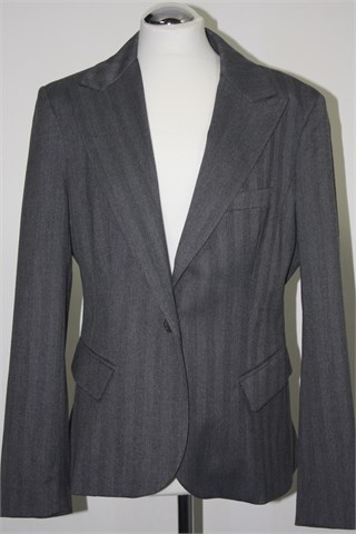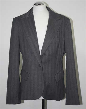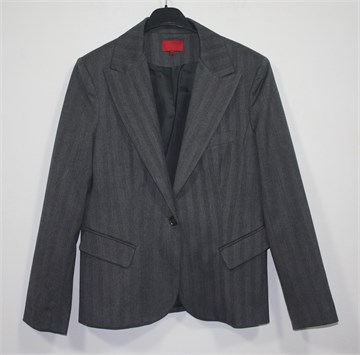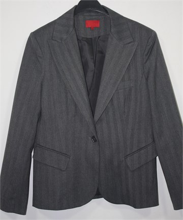 Yokoo sako tamnije sive boje s uzorkom na tkanini. Sako ima prednje kopčanje, dva džepića sa preklopom i jedan džepić na prsima. Prednji i stražnji ušitci, blago strukiran. Gumbići na dnu rukava. Podstavljen, blagi jastučići u ramenima.