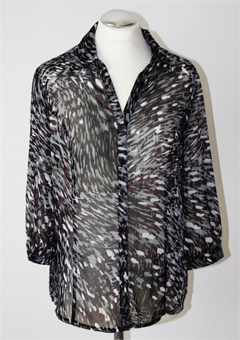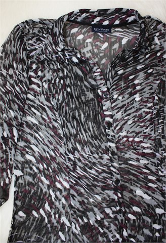 Your Sixth Sense (C&A) košulja sa poludugim rukavima, prošarani uzorak (boje i uzorak vidljivi na slikama - prevladavaju crna, ljubičasta, siva i bijela boja). Prednje kopčanje, gumbić na kraju svakog rukava. Tanja i lagana, providna. Blago rastezljiva.