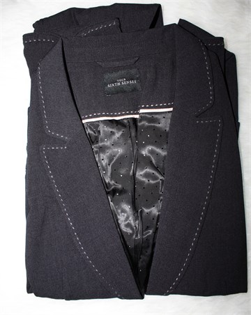 Your Sixth Sense (C&A) duži sako tamno sive boje, klasičnog kroja. Prednje kopčanje sa ukrasnim gumbima (jedan gumb se odšio i ne dolazi uz sako), bočni džepovi sa preklopom (djelomično još uvijek zašiveni). Jastučići u ramenima, podstavljen. Vrlo blago rastezljiv.