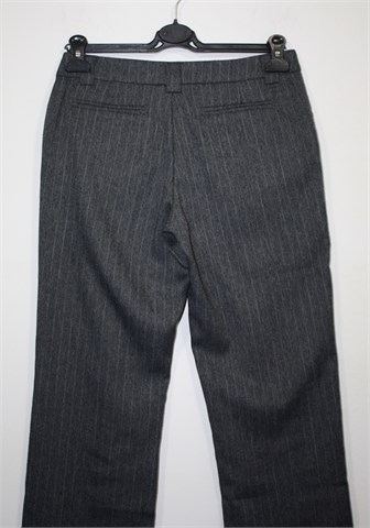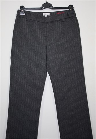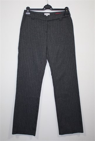 Zabaione jesensko/zimske hlače od laganog štofa, sive boje sa svijetlijim diskretnim prugama. Hlače imaju prednji cif i kopčanje, pasicu za uski remen. Prednji bočni, stražnji skriveni džepovi. Ravne i malo šire nogavice, klasičnog kroja.