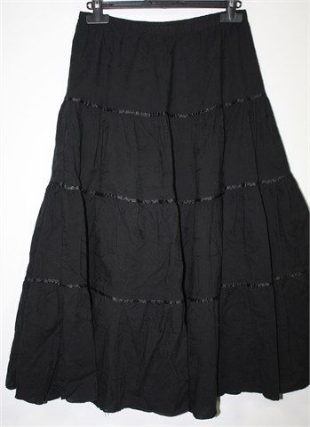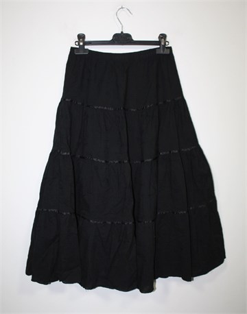Zafiro duža pamučna suknja crne boje, ukrašena diskretnim cvjetnim aplikacijama od crnog konca. Gumica u struku (prilagodljiva širina - vidjeti mjere), djelomično podstavljena. Lagana i prozračna.