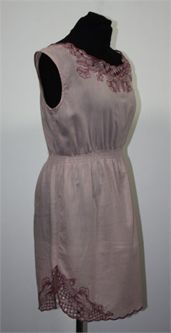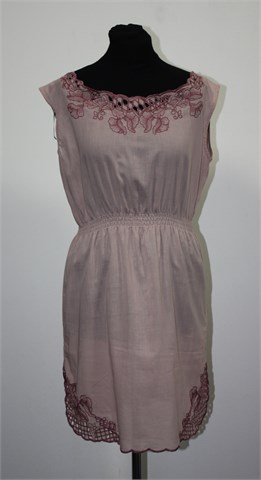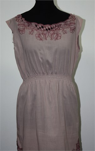 Zara TRF haljina bez rukava, prljavo roze boje. Aplikacije od konca oko ovratnika na dnu haljine (sa obje strane) - mjestimično su se malo izvukli končići oko tih ukrasnih šavova ali nije jako vidljivo. Blago stegnuta gumicama u struku, bočni prorezi (vidljivo na slici). Lagan i tanak pamuk, blago providan.