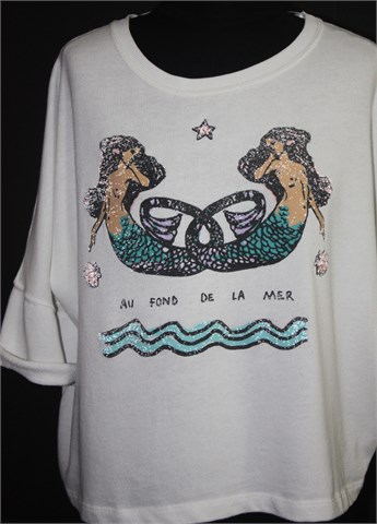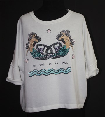 Zara Trafaluc oversized cropped top (široka i kraća majica) sa kraćim rukavima, bijele boje sa prednjim printom i aplikacijama. Tanji i mekan materijal.