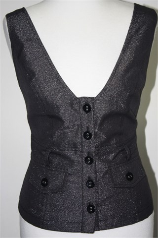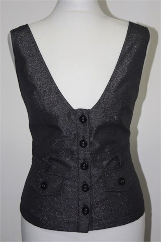 Zara TRF prsluk tamno sive boje sa sjajnim srebrnim nitima. Prednje kopčanje sa gumbima, prednji lažni džepovi. Ušice za remen (bez remena), vrlo blago rastezljiv.