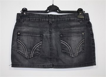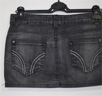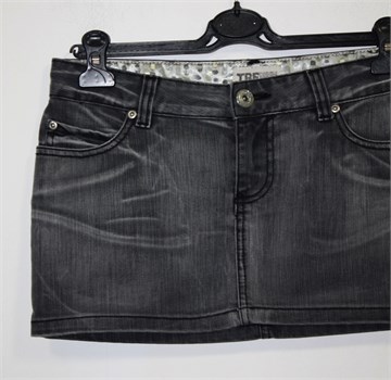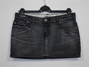 Zara TRF kratka suknja od trapera, prošarano tamnije sive boje. Prednji cif i kopčanje, pasica za remen. Prednji i stražnji džepovi (stražnji ukrašeni prošivima od srebrnog konca). Nije rastezljiva, nešto duža sa stražnje strane (vidjeti mjere). Malo se odšio šav ispod cifa ali je dupli pa nije rastvoreno.