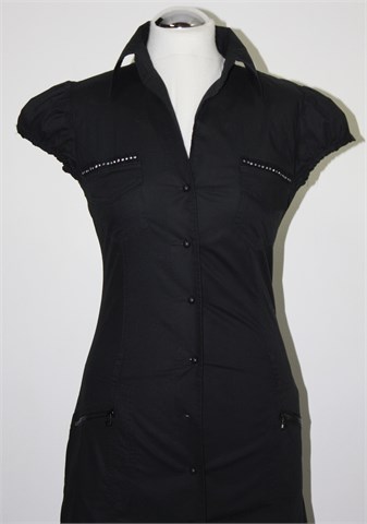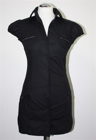 Zara TRF tunika crne boje sa kratkim rukavima. Prednje kopčanje, džepići na prsima (ukrašeni cirkonima) i bočni džepovi sa cifom. Pasica za remen, prednji i stražnji ušitci (strukirana). Blago rastezljiv materijal.