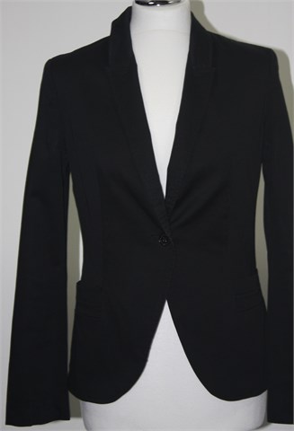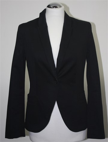 Zara blazer/sako crne boje, klasičnog kroja. Prednji i stražnji ušitci, strukiran. Prednji džepići, gumbi na krajevima rukava. Podstavljen.