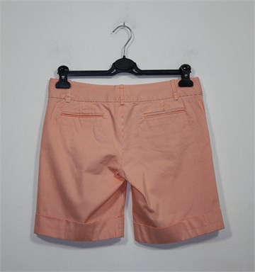 Zara kratke hlače/bermude, prugasta kombinacija bijele i narančaste boje. Prednji cif i kopčanje, pasica za remen. Prednji bočni, stražnji ukrasni džepovi. Blago rastezljive.