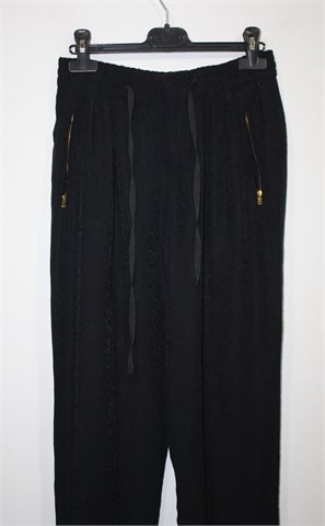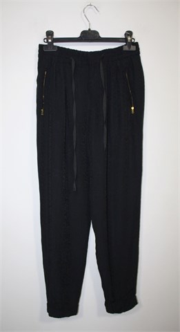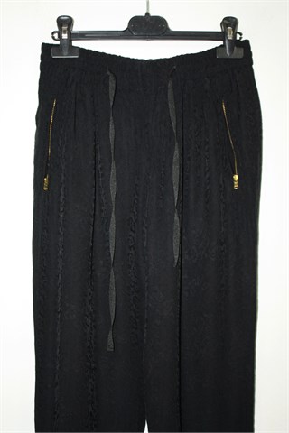 Zara hlače od viskoze, crne boje sa diskretnim animal uzorkom na materijalu (vidjeti slike). Prednji cif i kopčanje, rastezljiva pasica sa vezicama. Prednji bočni džepovi (sa cifom), stražnji skriveni džepići. Nisu rastezljive.