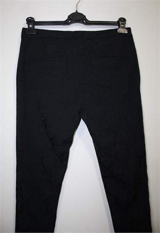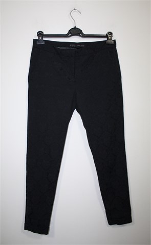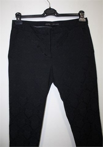 Zara hlače crne boje sa žakard uzorkom. Prednji cif i kopčanje, prednji bočni džepovi (stražnji ukrasni). Uže nogavice, rastezljive (odlično stoje - model kao tajice, dužina do gležnja).