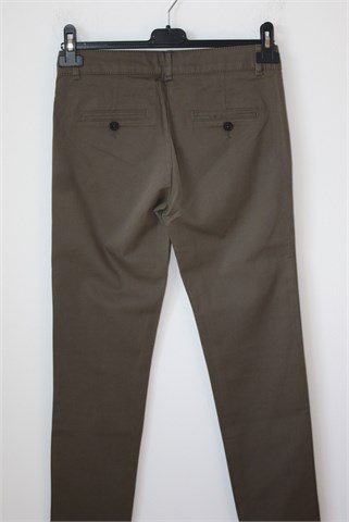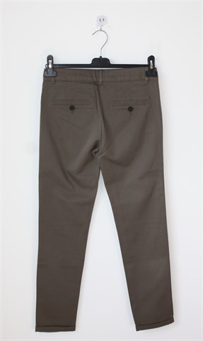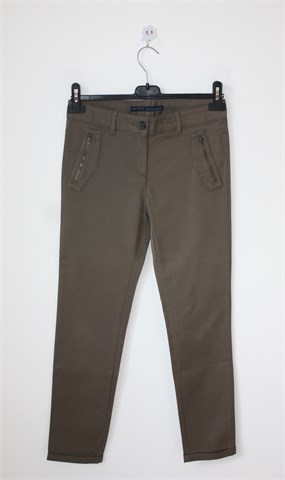 Zara basic hlače maslinasto-smeđe boje. Prednji cif i kopčanje, pasica za remen. Prednji i stražnji ukrasni džepovi, male mandžete na krajevima nogavica. Čvrst i blago rastezljiv materijal.