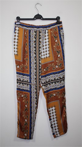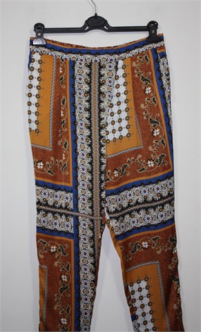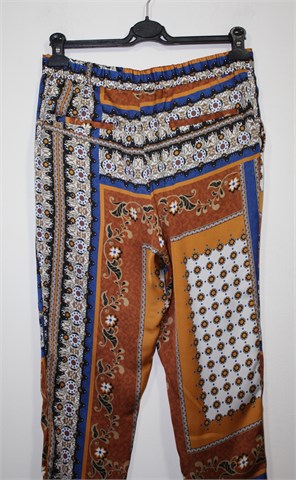 Zara odlične hlače sa šarenim uzorkom (boje i uzorci kao na slici), šire u gornjem dijelu a uže u nogavicama (nogavice su dosta uske pa nisu za jače listove i bedra). Sa prednje strane mali preklop sa gumbićem i kopčicom, sa stražnje strane pasice je guma pa je širina dosta prilagodljiva. Prednji bočni džepovi, stražnji ukrasni džepovi. Lagane i prozračne, materijal je na dodir svilenkast.