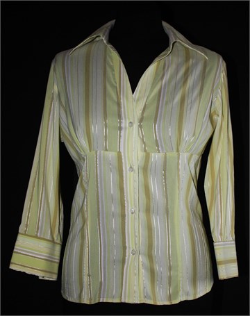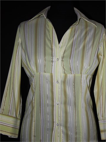 Zara prugasta košulja sa poludugim rukavima u kombinaciji žute/zelene/bež boje, mjestimično protkana sjajnim nitima. Stražnje vezanje sa dvije vezice. Mekana i rastezljiva.