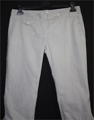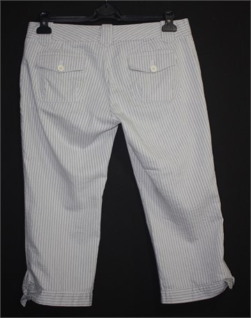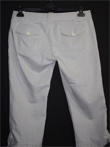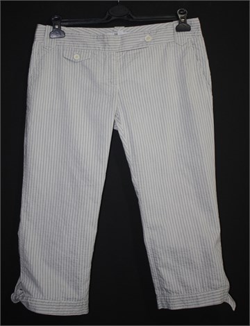 Zara poluduge hlače bijele boje sa plavim prugama. Materijal ima blago zgužvani efekt. Hlače imaju prednji cif i kopčanje, pasicu za remen. Prednji bočni džepovi, stražnji sa gumbićima. Na dnu nogavica deblje vezice koje se mogu bočno zavezati. Lagan materijal, nije rastezljiv.