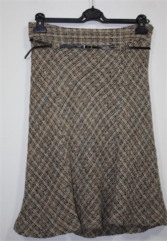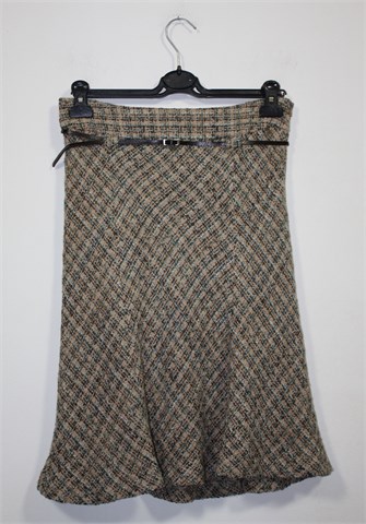 Zara Basic suknja bež boje sa prošaranim uzorkom u smeđe-plavoj boji. Bočni cif, tanke ušice za remen sa pripadajućim remenčićem (smeđi, lakirani sa zmijskim uzorkom - može se skinuti). Podstavljena, rastezljiva.