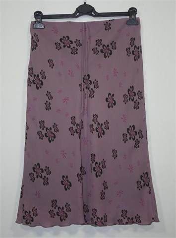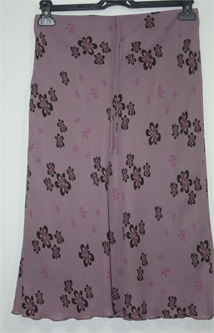 Zara basic duža suknja zagasito lila/ljubičaste boje sa cvjetnim printom. Ukrasna vezica sa prednje strane, u struku dosta čvrsta gumica pa i nije baš rastezljivo. Vrlo lagana i prozračna, podstavljena.
