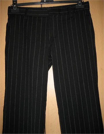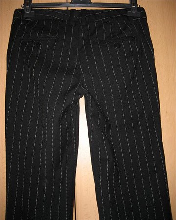 Tople vunene hlače, ne predebele. Pasica za remen, prednji bočni i stražnji džepovi sa gumbićima. Ravne, malo šire nogavice, niži struk. Blago rastezljive. Crne boje sa bijelim, isprekidanim crtama.