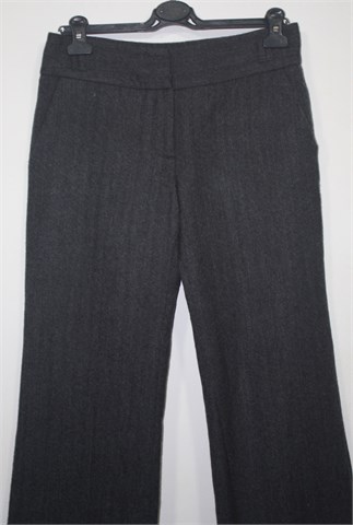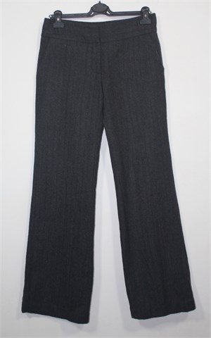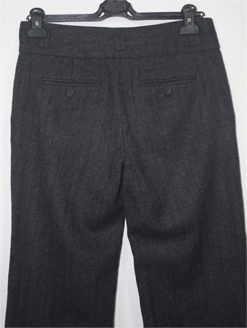 Zara basic vunene hlače prošarano tamnije sive boje (sitan i diskretan uzorak riblje kosti). Prednji cif i kopčanje, uska pasica za remen. Prednji bočni, stražnji skriveni džepovi sa gumbom. Tople i mekane, srednje debeli štofasti materijal.