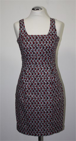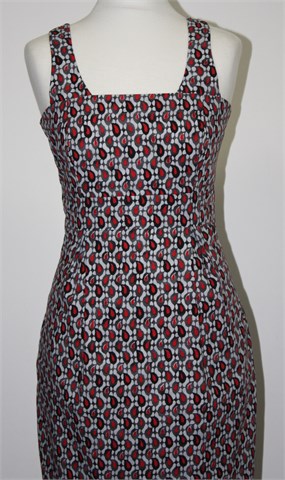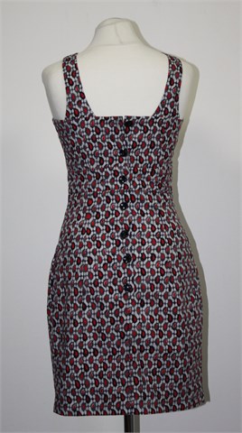 Zelinka haljina bez rukava sa šarenim retro printom (boje kao na slici - crvena, crna, bijela, siva). Sa stražnje strane kopčanje sa gumbima, prednji bočni džepovi. Tanji pamuk.