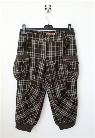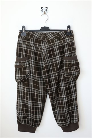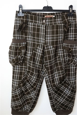 Zaphirus poluduge zimske hlače tamnije maslinasto-smeđe boje sa prugasto-kariranim uzorkom (kao na slikama). Prednji cif i kopčanje, pasica za remen. Bočni džepovi, blago stegnute na dnu nogavica. Topli štofasti materijal, podstavljene debljom podstavom.