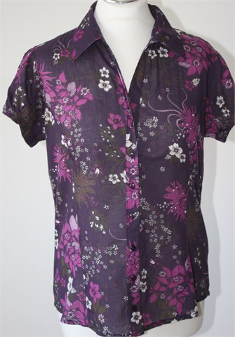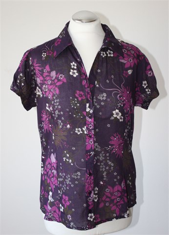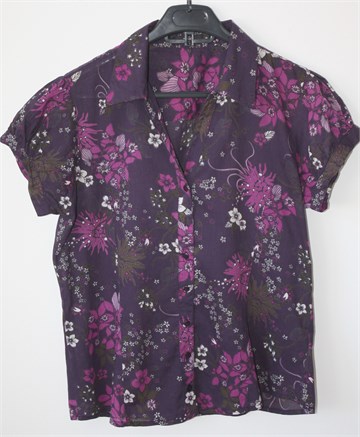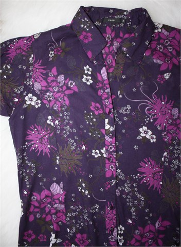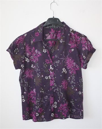 Zero košulja sa kratkim rukavima, zagasito tamno ljubičaste boje sa šarenim cvjetnim printom (boje i uzorak printa vidljivi na slikama). Prednje kopčanje, blago strukirana. Tanka i lagana, nije rastezljiva.