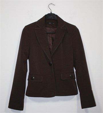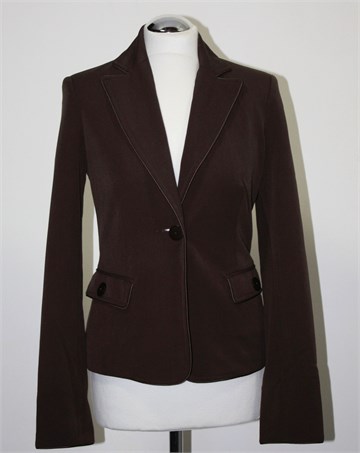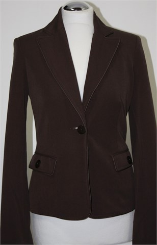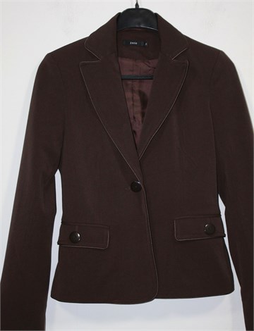 Zero sako/blazer tamno smeđe boje. Prednje kopčanje sa jednim gumbom, bočni džepovi sa preklopom i gumbom. Jastučići u ramenima (ušiveni), podstavljen. Materijal je gladak i mekan, rubovi sakoa obrubljeni su sa sjajnom trakom. Blago rastezljiv materijal.