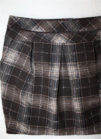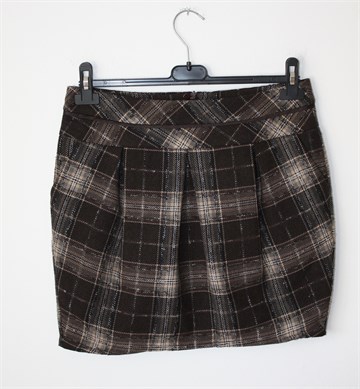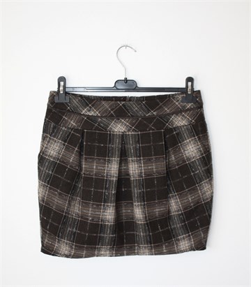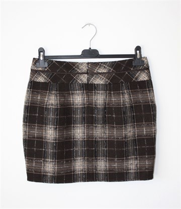 Zero suknja od štofastog materijala, smeđe boje sa uzorkom (boje i uzorak vidljivi na slikama). Stražnji cif i gumbić, podstavljena. Prednji bočni džepovi, prednje faldice.