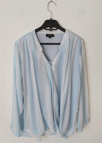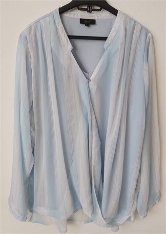 Zhenzi bluza sa dugim rukavima, kombinacija bijele i plave boje (vidljivo na slikama). Prednji fiksni preklop (kopčanje sa ukrasnim gumbićem), ukrasni gumbići na kraju svakog rukava. Providna ali ima podstavu/podmajicu plave boje (osim rukava). Duža sa stražnje strane.