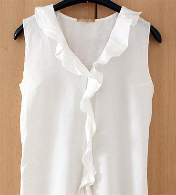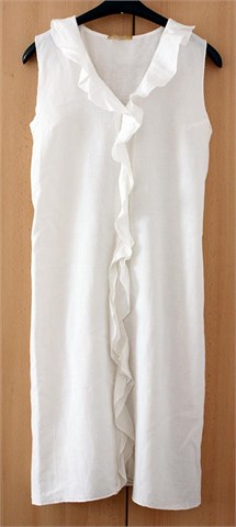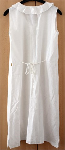 Sa volančićem na prednjoj strani preko cijele dužine haljine i oko dekoltea, sa stražnje strane trakica kojom se određuje širina haljine, inače ravnog kroja, mali prorezići, ušitci za grudi. Skriveni prednji cif.